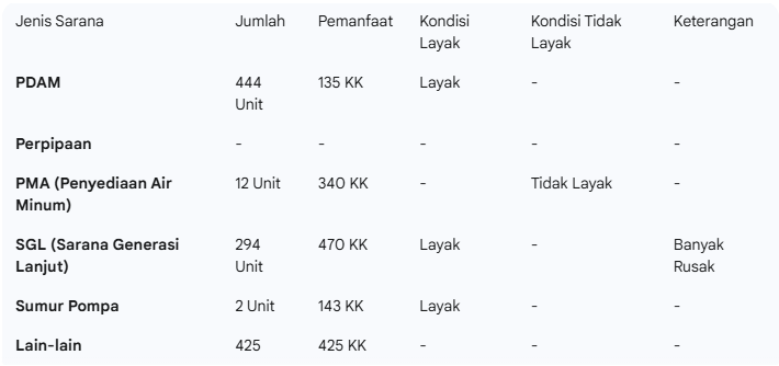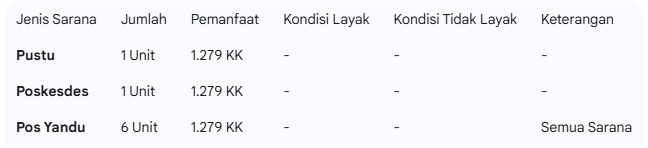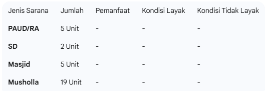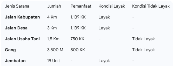 Jaringan jalan utama dan pendukung memiliki panjang total 8,5 Km (Jalan Kabupaten dan Jalan Desa) serta 3.500 meter (Gang)